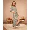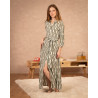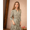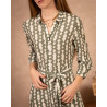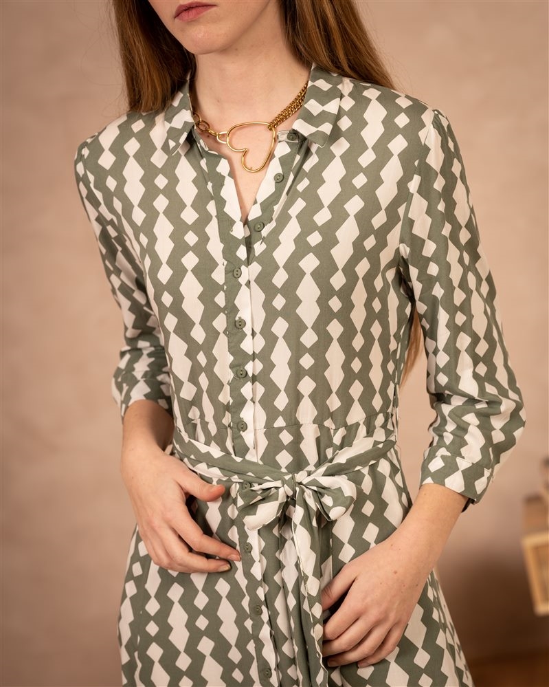 • Robe chemise longue • Imprimé à motifs géométriques blanc et kaki • Manches 3/4 resserrées par un poignet fermé par un bouton • Boutonnière tout le long de la robe • Ceinture en tissu à nouer autour de la taille • Matière fluide