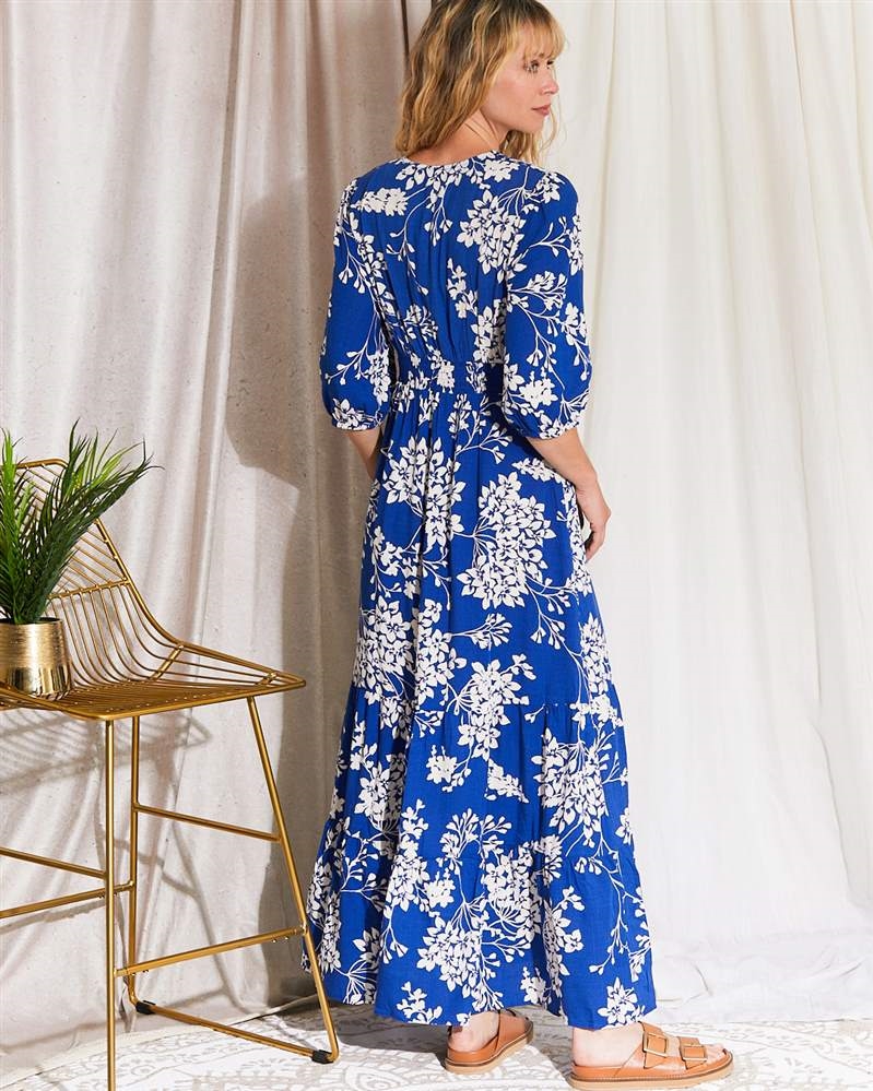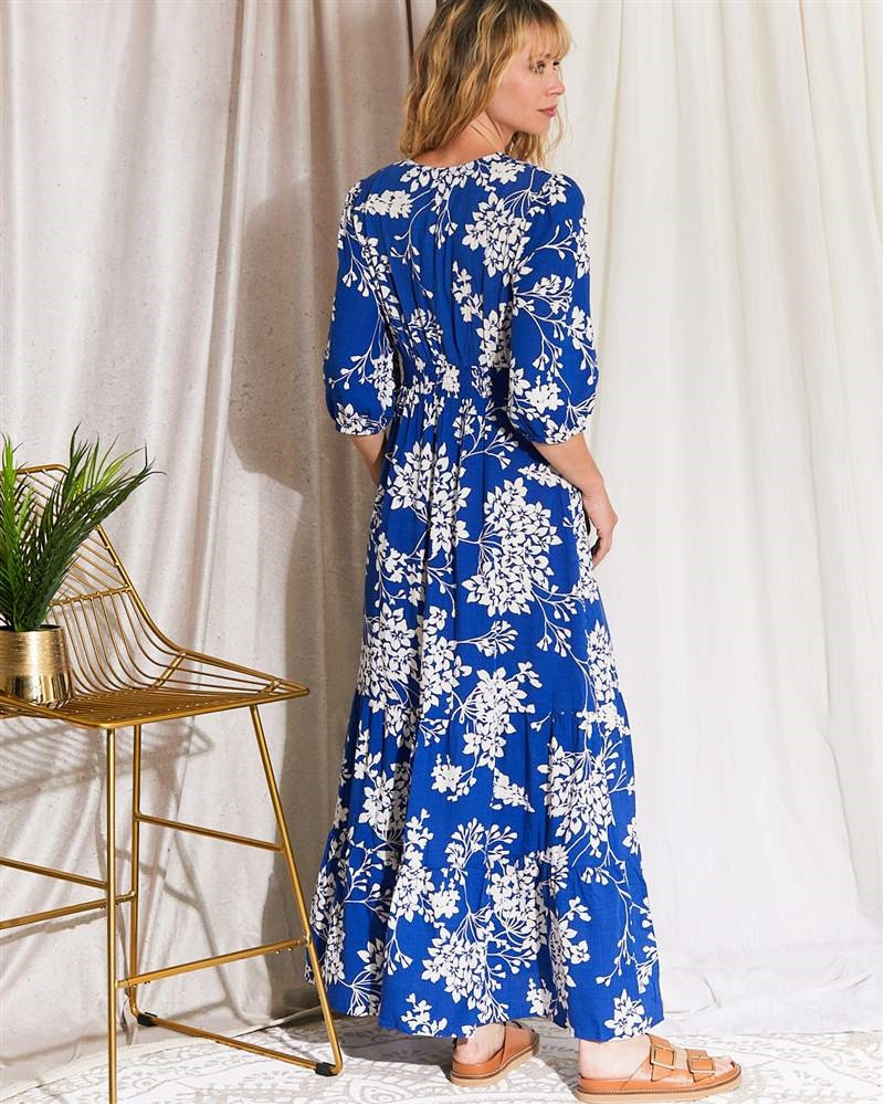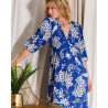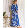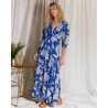 Détails : Robe longue fluide imprimée bleu royal et blanc. Col V plongeant. Manches trois-quarts bouffantes.