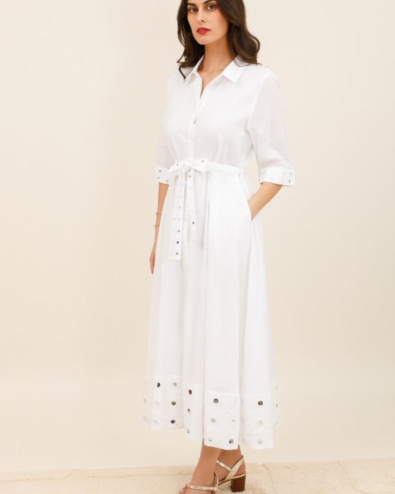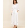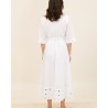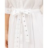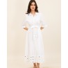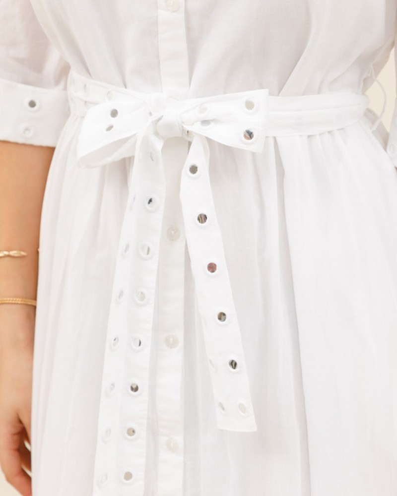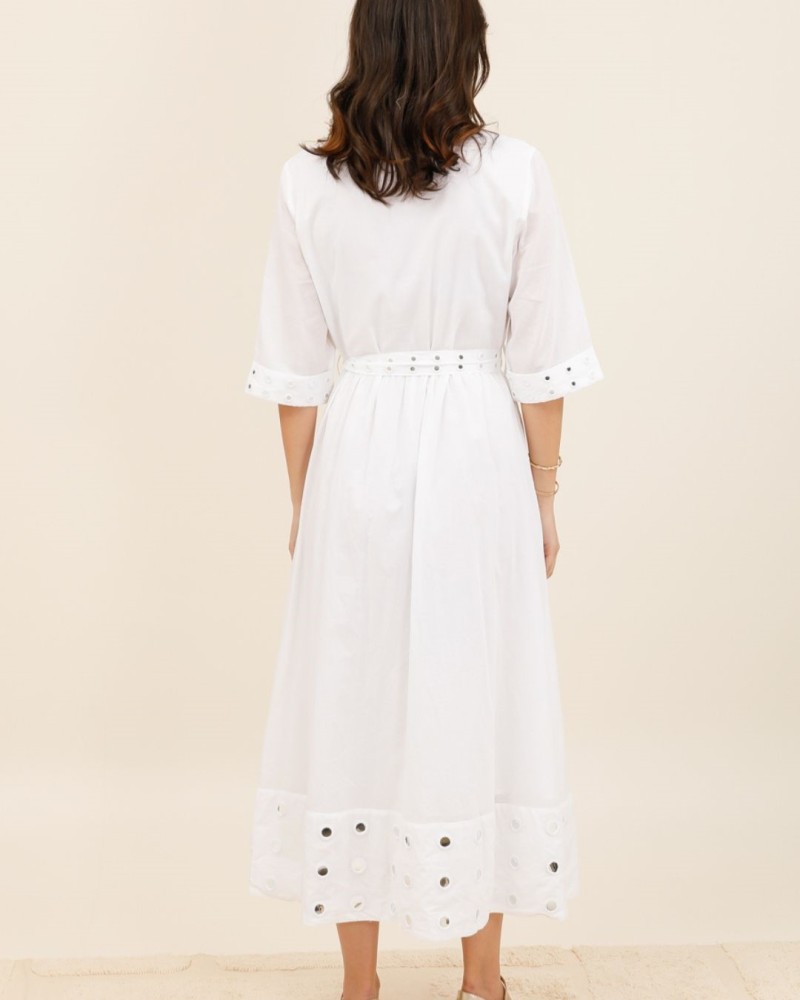 Ses détails ajourés et ses finitions délicates au niveau des manches, de la ceinture et du bas de la robe apportent une touche raffinée et originale. Confectionnée dans une matière légère et agréable à porter, elle est idéale pour les journées ensoleillées ou les occasions spéciales.