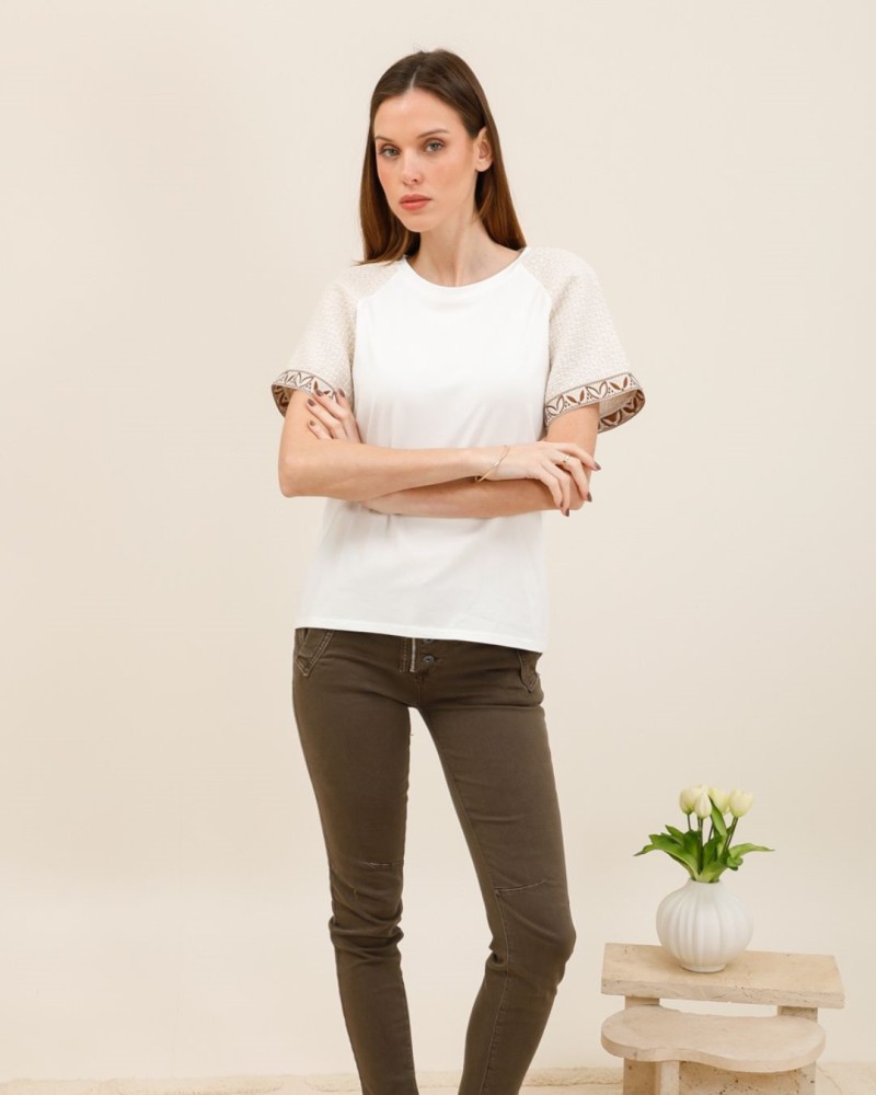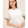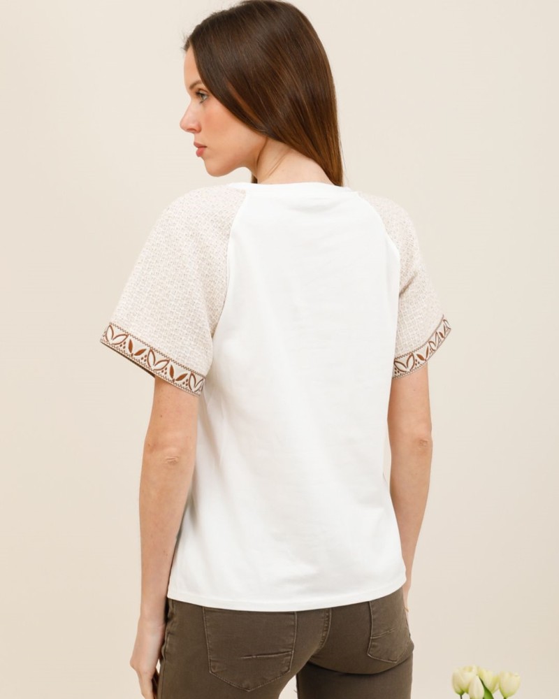 Le tee-shirt Dina est la pièce parfaite pour twister un basique avec subtilité. Son corps uni épuré est mis en valeur par des manches contrastées texturées, rehaussées de jolis détails brodés pour une touche artisanale et tendance.