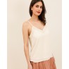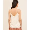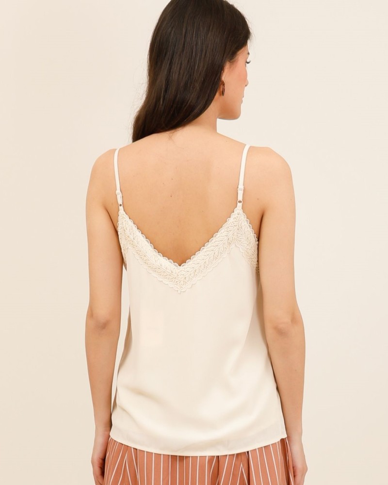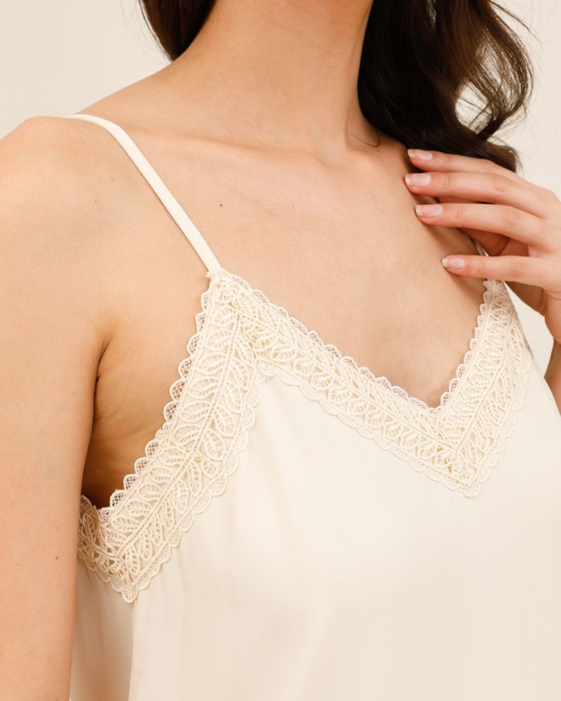Son encolure en V, délicatement soulignée de dentelle fine, apporte une touche romantique et élégante. Les bretelles fines et ajustables assurent un maintien idéal, tandis que sa coupe fluide épouse le corps sans le marquer.