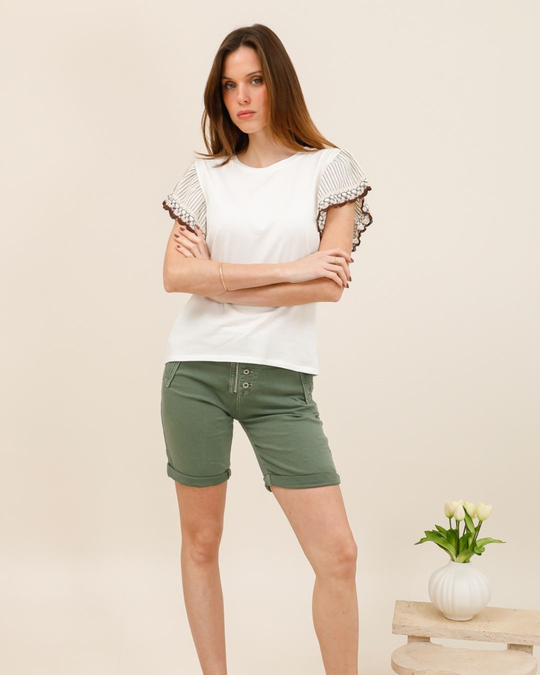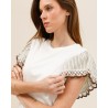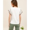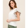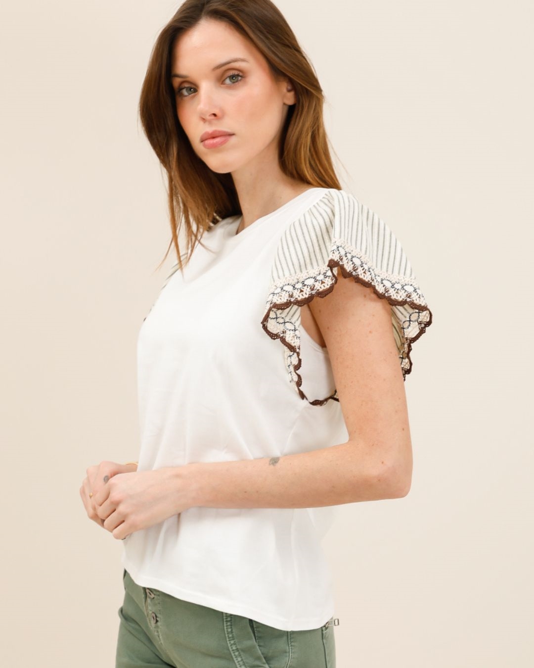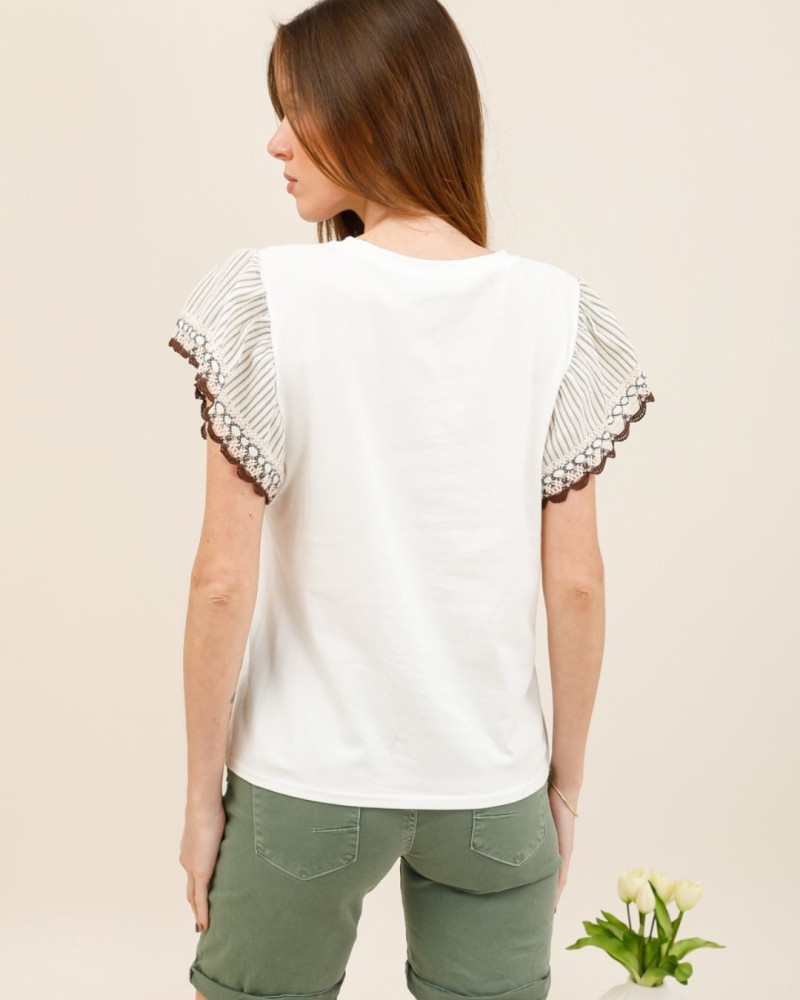 Craquez pour le tee-shirt Shani, une pièce élégante qui revisite le basique blanc avec une touche de caractère. Ses manches courtes en tissu rayé sont sublimées par de délicates finitions en dentelle contrastée, apportant une allure féminine et raffinée.