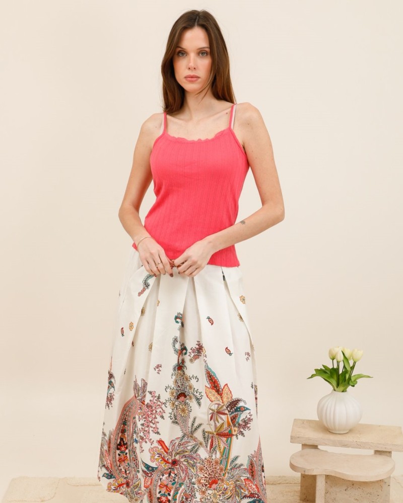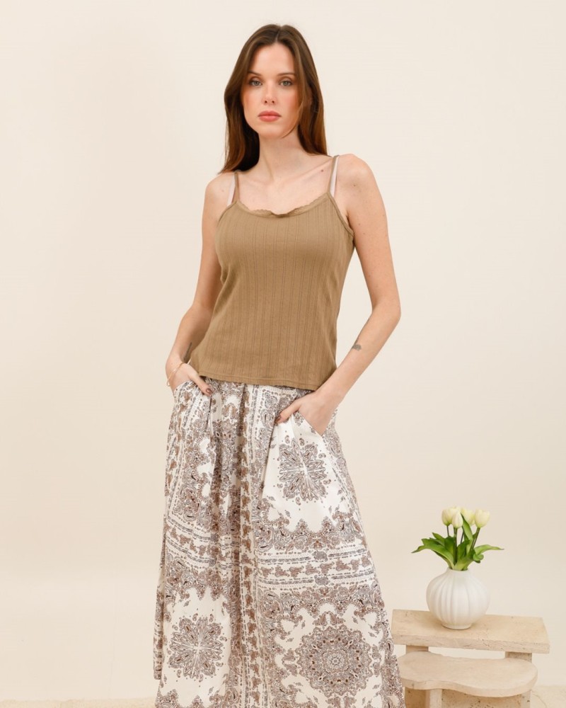 Le top Aline est la pièce essentielle de votre dressing estival. Léger, féminin et facile à porter, il séduit par sa maille côtelée et ses finitions délicatement festonnées qui soulignent le décolleté avec subtilité.