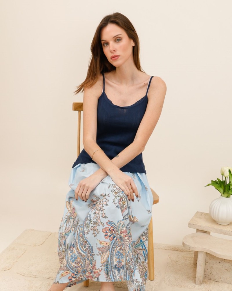 Le top Aline est la pièce essentielle de votre dressing estival. Léger, féminin et facile à porter, il séduit par sa maille côtelée et ses finitions délicatement festonnées qui soulignent le décolleté avec subtilité.