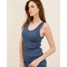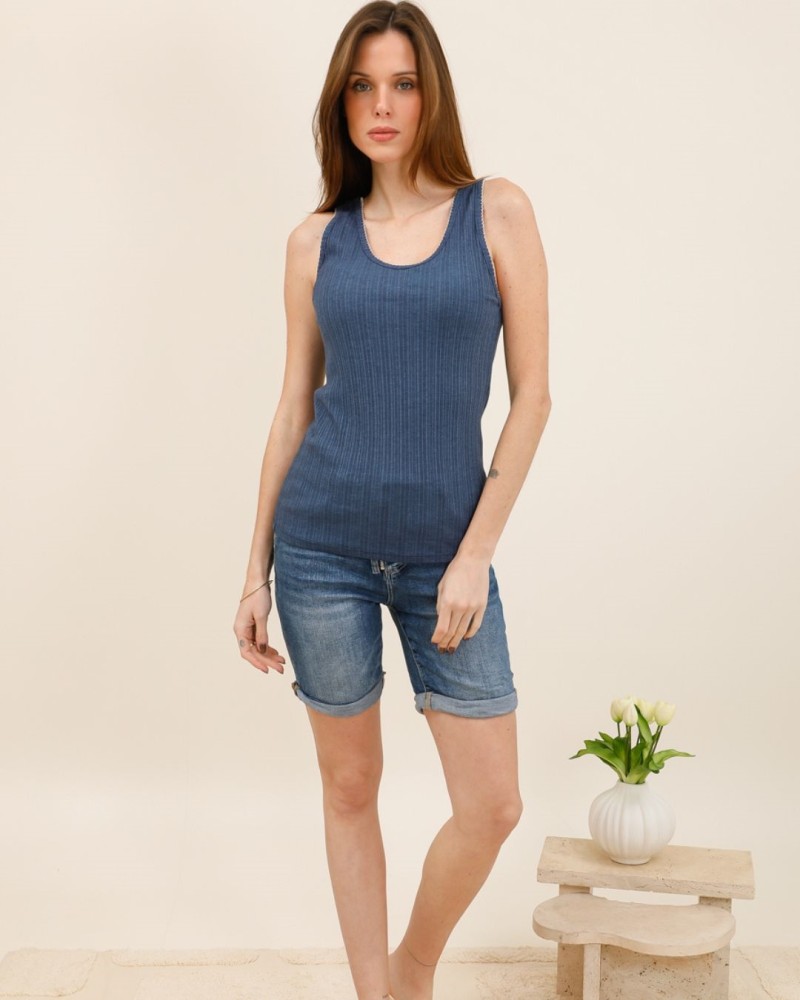 Le top Ameline revisite le débardeur classique avec une touche féminine et raffinée. Sa maille côtelée épouse délicatement la silhouette, tandis que les finitions festonnées contrastées apportent une subtile élégance.
