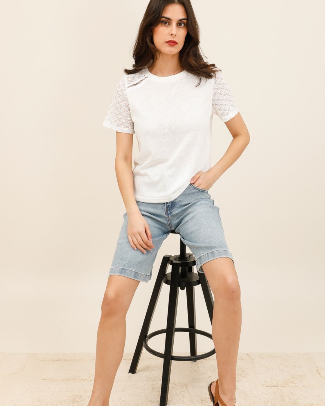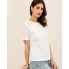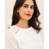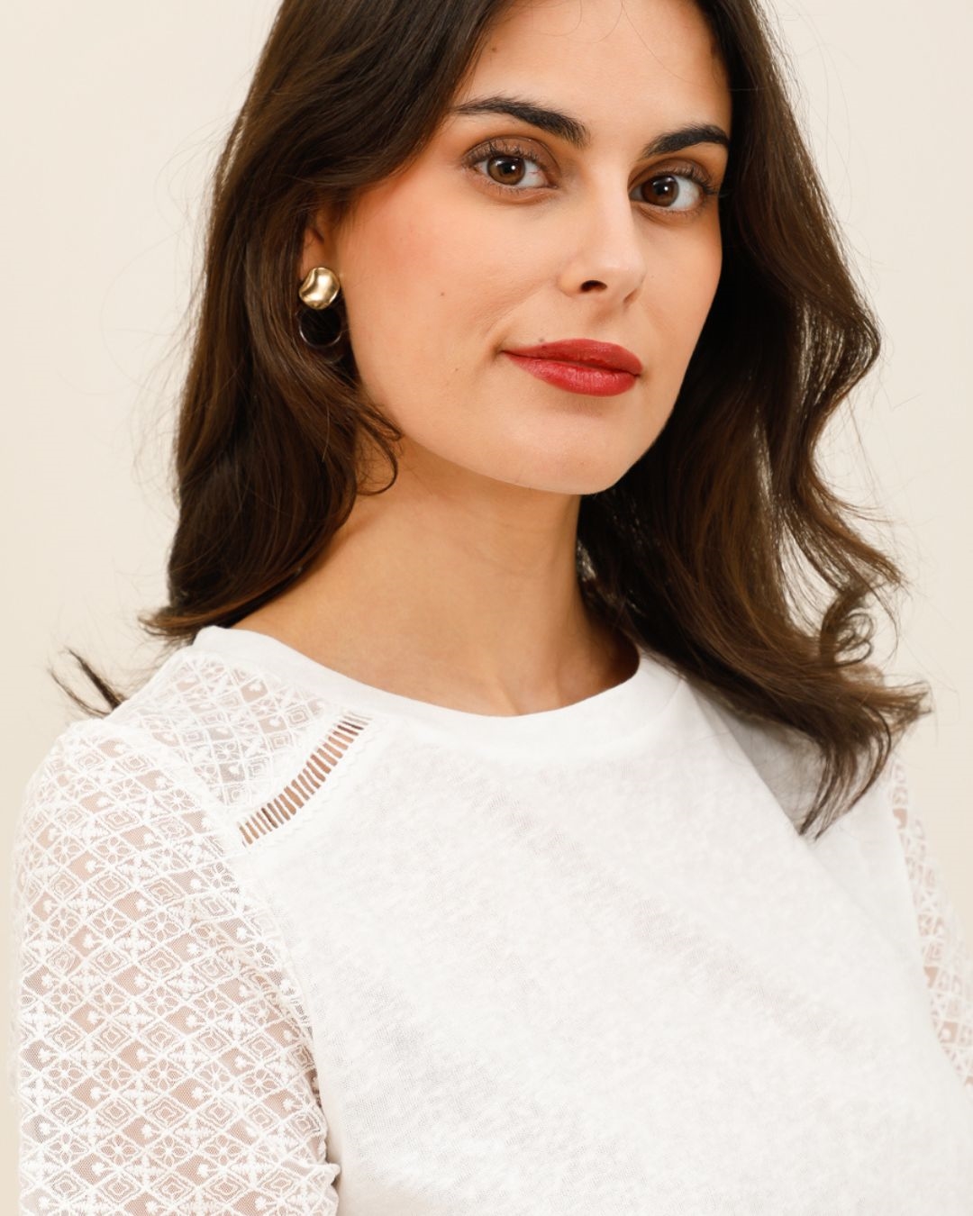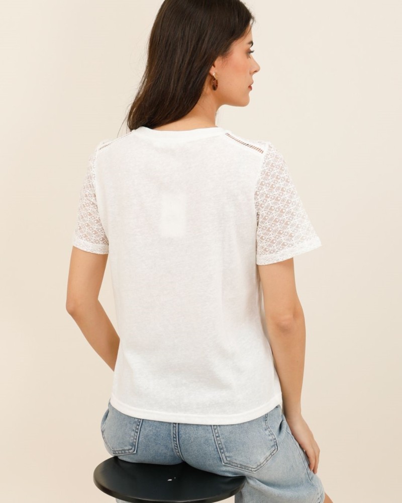 Ses manches courtes en dentelle délicate apportent une note sophistiquée et légère, jouant subtilement avec la transparence pour un rendu élégant. Le détail ajouré au niveau des épaules renforce son caractère unique et tendance