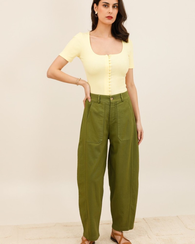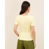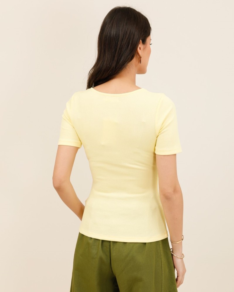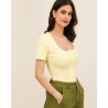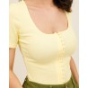 Son encolure carrée légèrement arrondie met en valeur le décolleté avec subtilité, tandis que sa rangée de petits boutons ton sur ton apporte une touche délicate et féminine. Sa coupe ajustée en fait un essentiel facile à porter, du look casual au style plus sophistiqué.