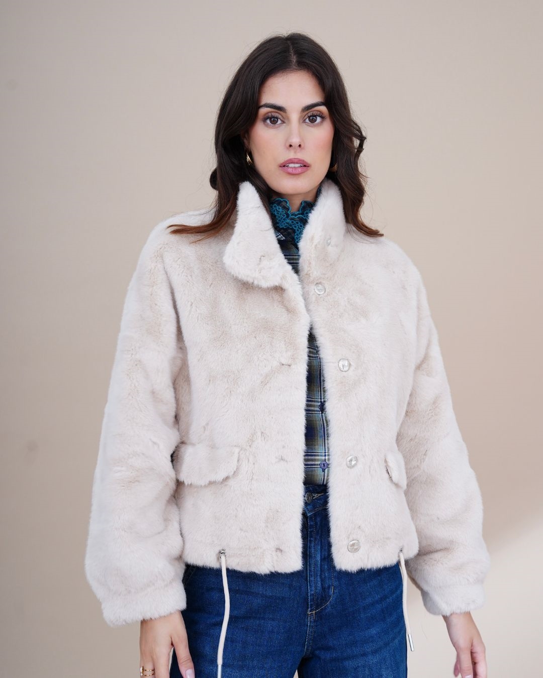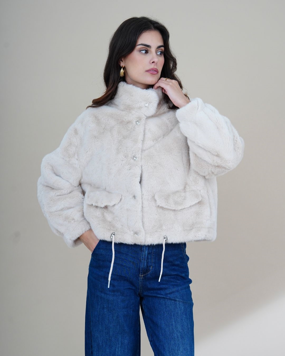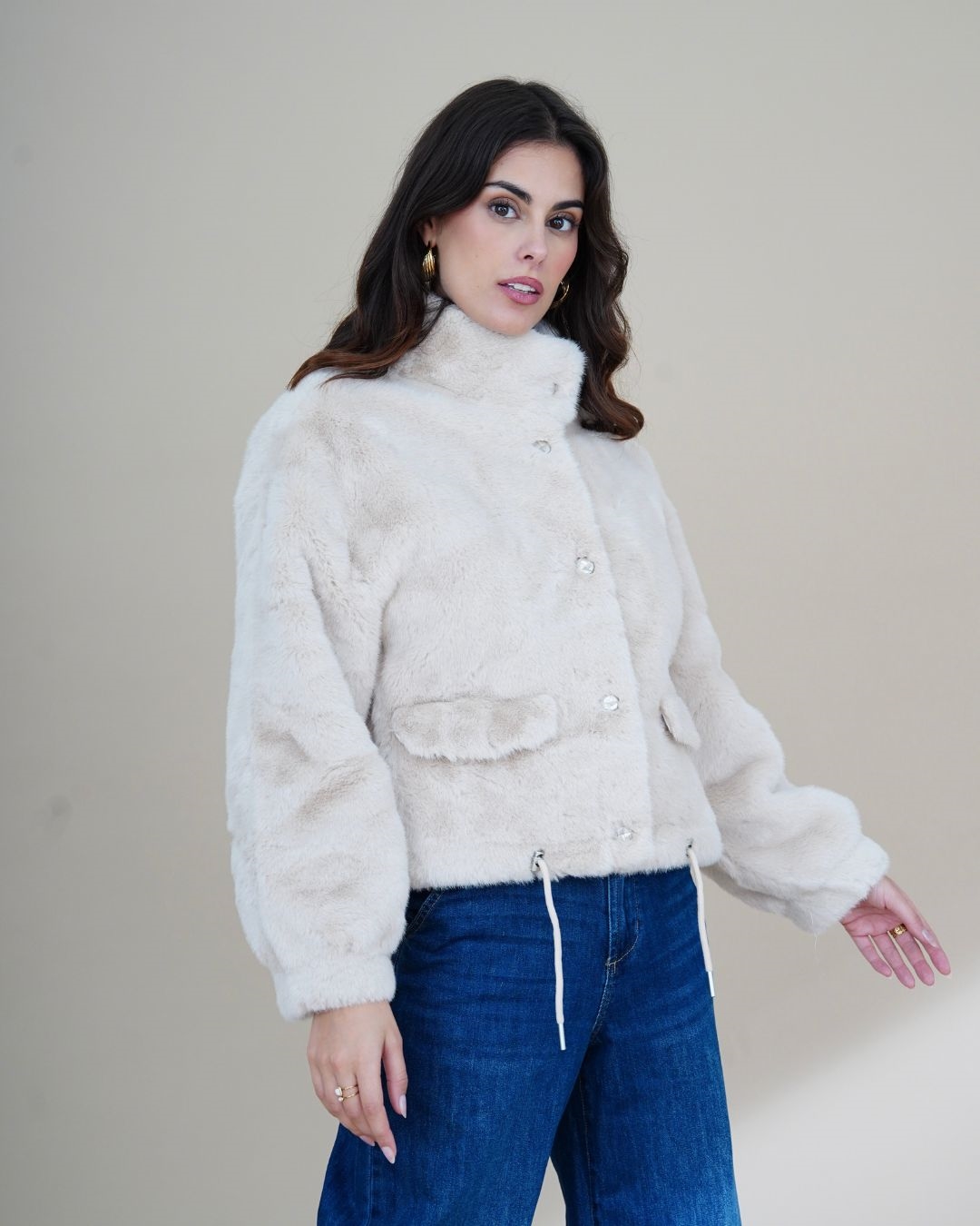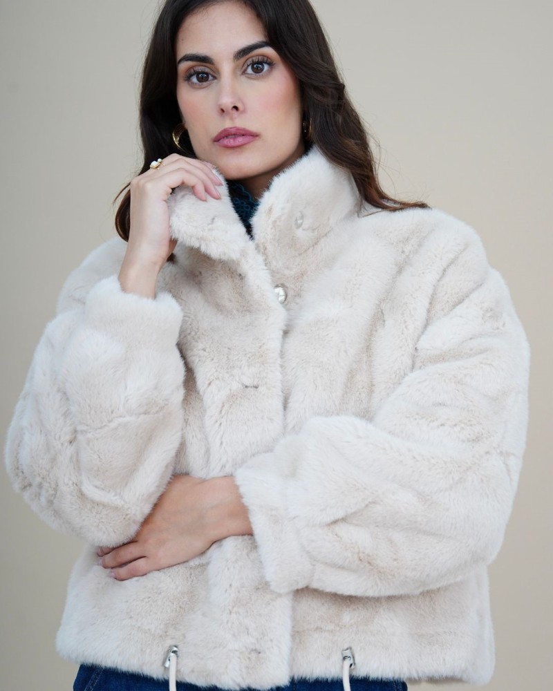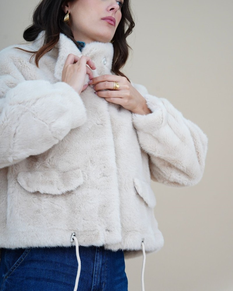 Apportez une touche d’élégance et de confort à vos looks avec la veste Eden. Confectionnée dans une fausse fourrure douce et soyeuse, elle allie chaleur et style pour la saison froide. Son design moderne présente une coupe droite légèrement oversize, des manches longues bouffantes, deux poches à rabat pratiques et un cordon ajustable à la taille pour souligner la silhouette.