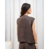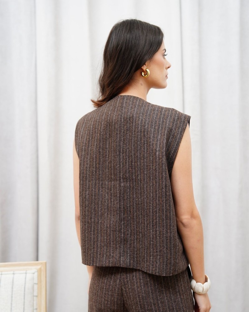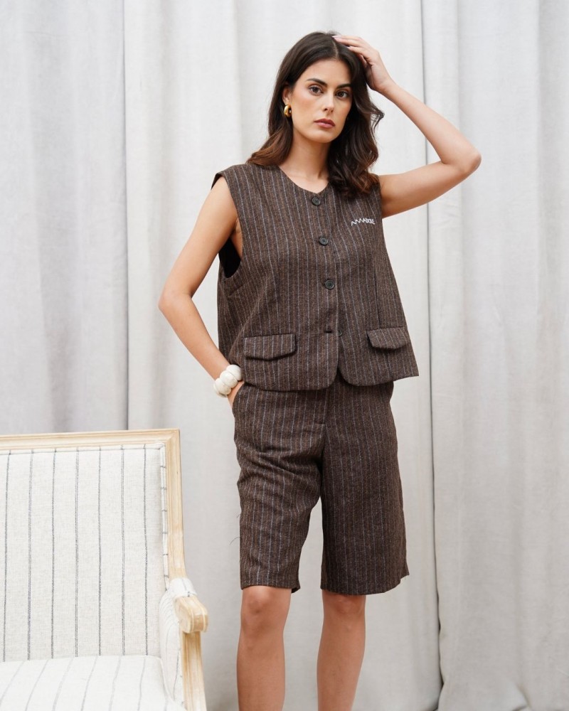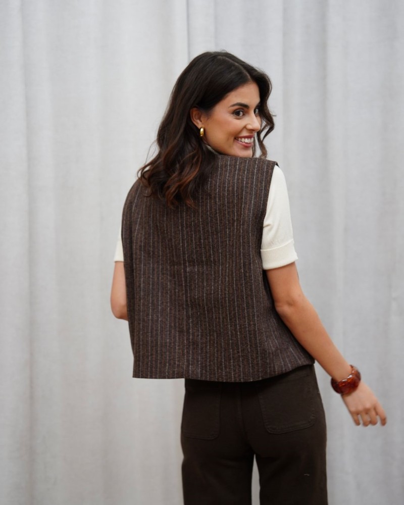 La veste Francis est une pièce élégante et tendance qui modernise le style classique. Confectionnée dans une matière texturée à fines rayures, elle se distingue par sa coupe droite sans manches et ses poches à rabat qui apportent une touche structurée. Fermée par de jolis boutons contrastés, elle se porte facilement en gilet chic ou en veste légère. Associée au short Brent assorti, la veste Francis compose un ensemble raffiné et original, idéal pour un look affirmé et contemporain.