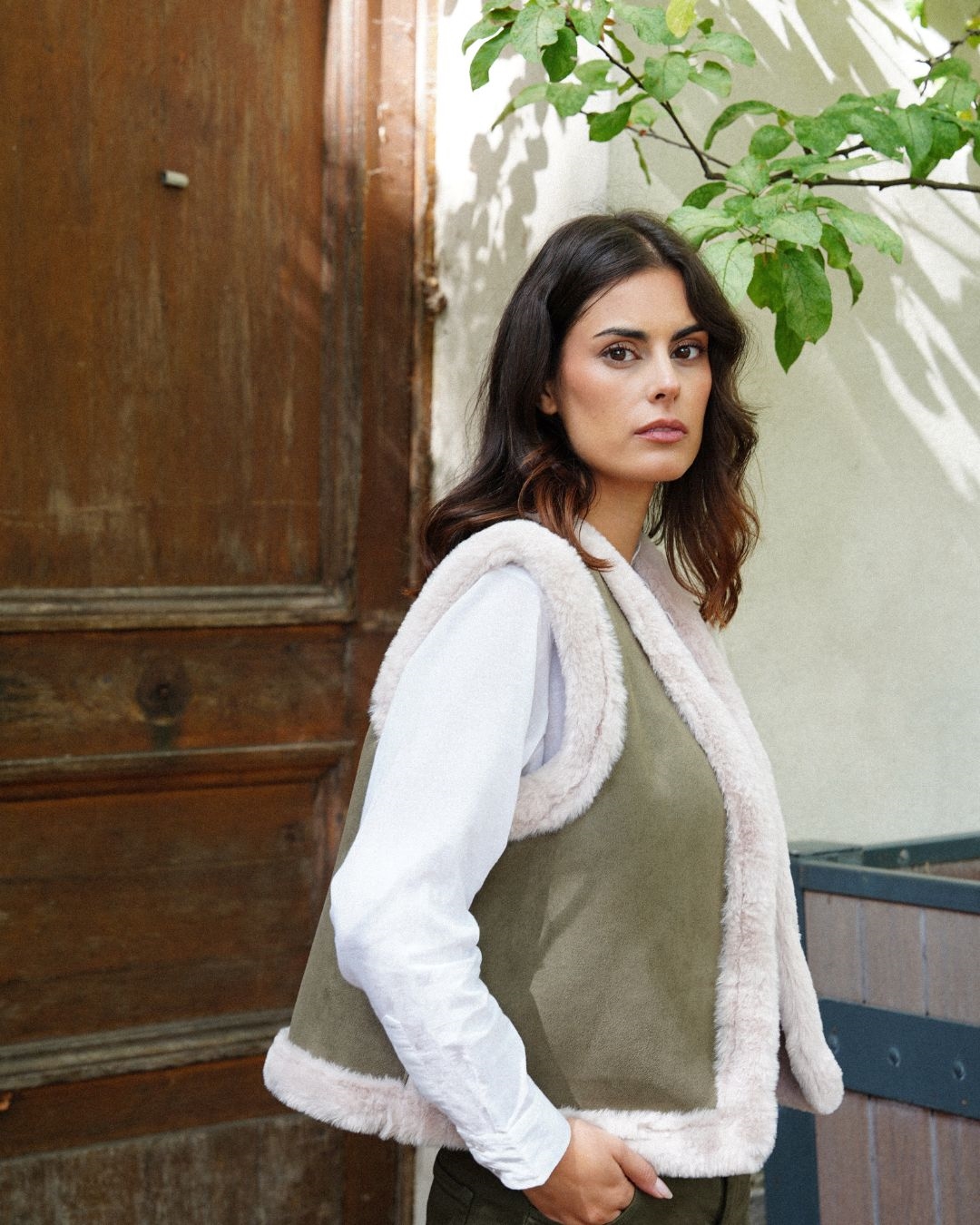 Le gilet Inaya est la pièce parfaite pour adopter un look chic et décontracté en toute saison. Sa coupe droite sans manches et son design réversible effet suédine et fausse fourrure offrent un style élégant et confortable. Léger mais chaud, il se porte facilement sur une chemise, un pull fin ou même une robe pour un rendu tendance.