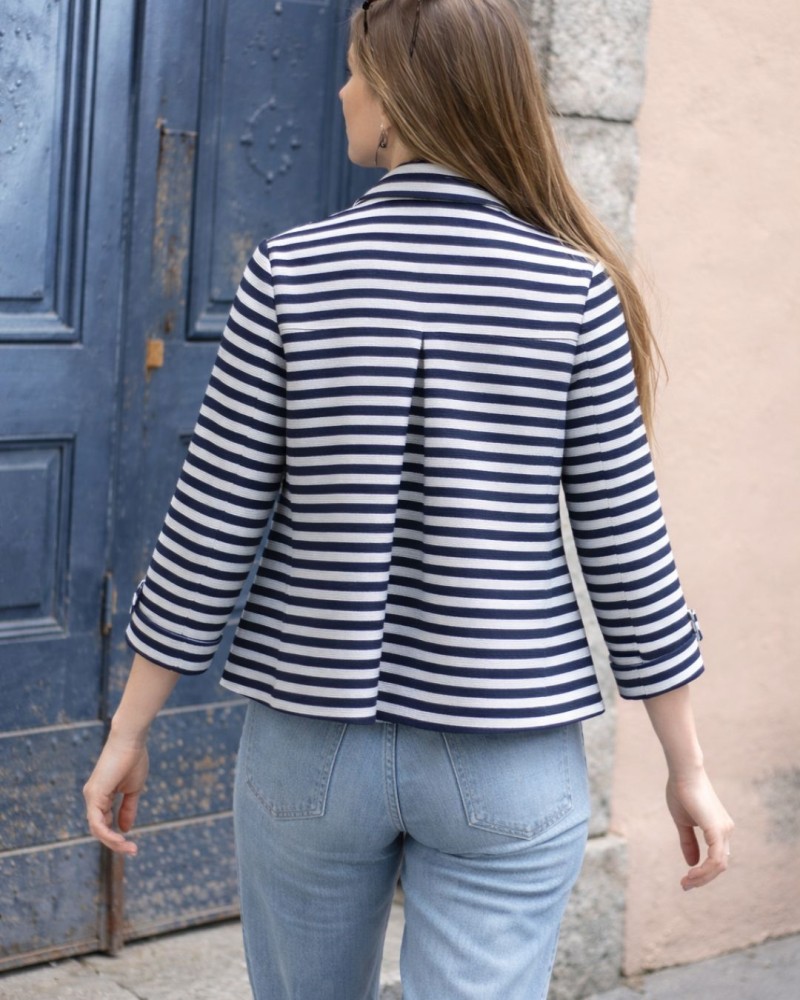 Disponible en version rayée bleu marine ou rouge, la Marin veste se marie parfaitement avec un jean pour un look casual, ou avec un short ou une jupe pour une allure plus estivale et sophistiquée.