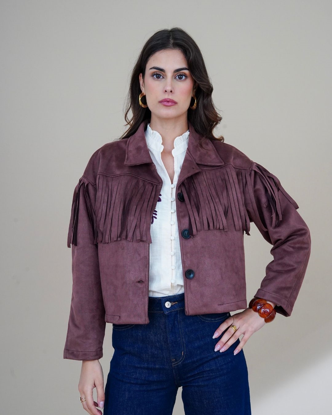 Apportez une touche western chic à vos looks avec la veste Stone. Confectionnée en matière effet daim doux au toucher, elle séduit par ses franges élégantes qui parcourent l’avant et les manches. Sa coupe courte et droite met en valeur la silhouette tout en restant confortable. Polyvalente et tendance, la veste Stone se porte facilement sur une blouse ou un pull pour un style affirmé. Disponible en plusieurs coloris pour s’adapter à toutes vos envies.